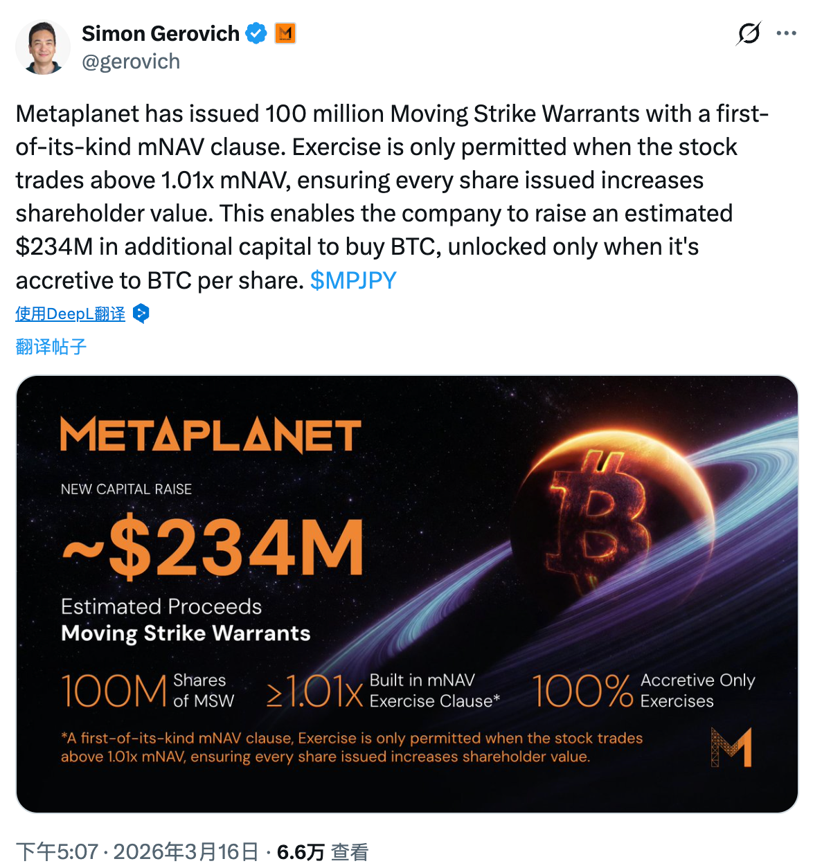 第二条:发行首份带「mNAV」条款的可移动认股权证(MSW),规模 1 亿股。该权证仅在公司股价达到 mNAV(每枚比特币对应的净资产价值)的 1.01 倍或以上时方可行使。Simon Gerovich 表示,这一设计将使公司能够筹集约 2.34 亿美元的额外资金用于收购比特币。