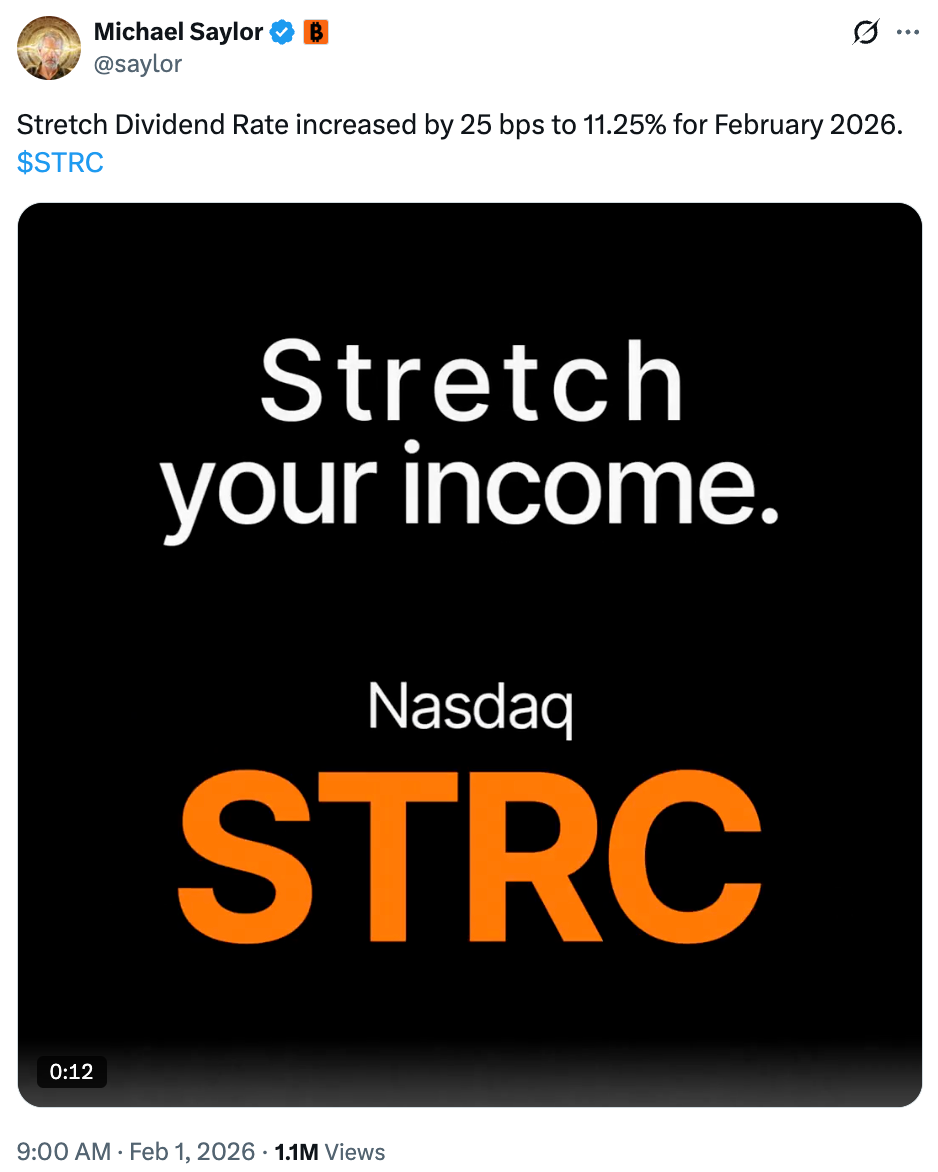 2 月 1 日,Strategy 创始人 Michael Saylor 发文宣布,Strategy 永续优先股 STRC 的 2 月股息率上调 25 个基点至 11.25%。股息率每月调整一次,Strategy 可通过与该产品挂钩的市价发行(ATM)方式发行股票,从而将能募集更多资金用于增持比特币。
