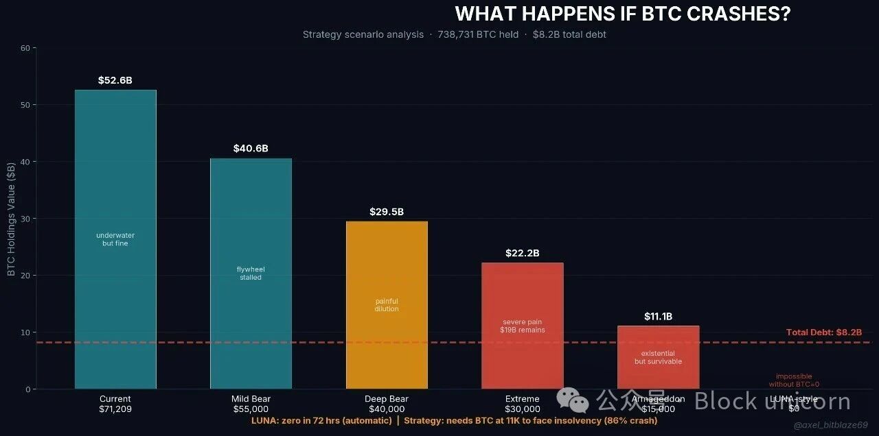 比特币价格需要跌至 8,000-11,000 美元,跌幅达 85-90%,这是自 2020 年以来从未见过的水平,Strategy 的比特币价值才会接近其全部债务。