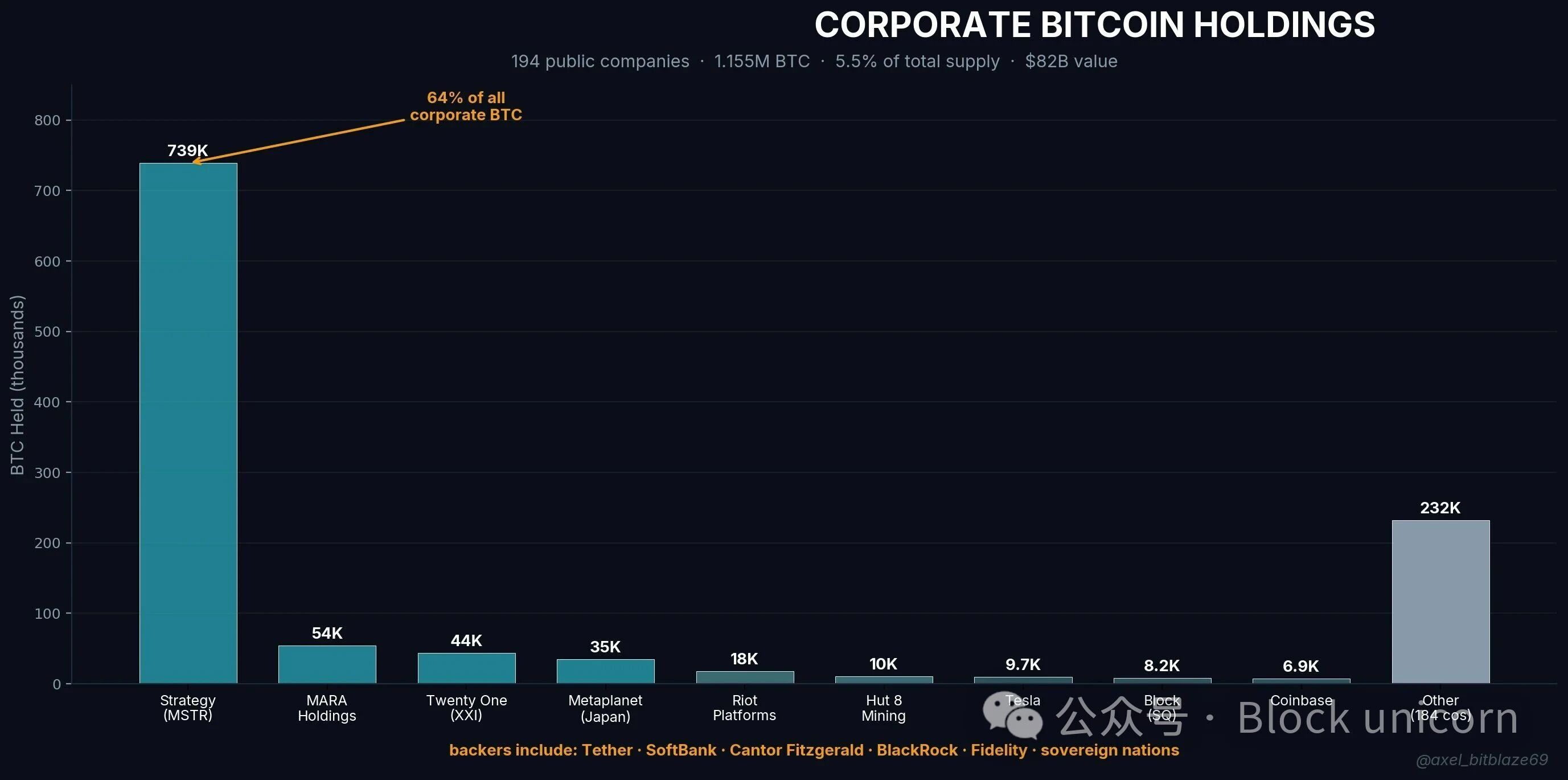 总计:约 115.5 万枚 BTC(占总供应量的 5.5%),价值约 820 亿美元。
