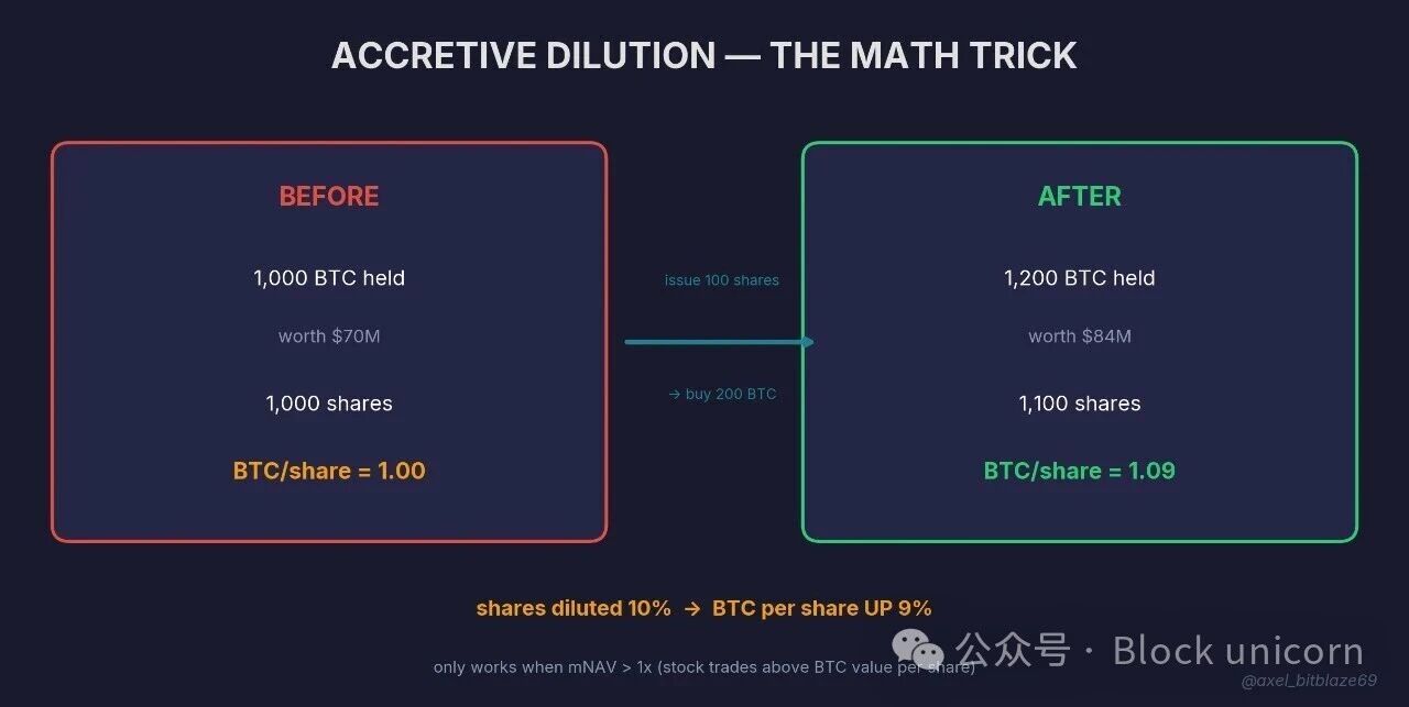 当 MSTR 股票的交易价格高于其持有的比特币价值(市净值 > 1 倍)时,你发行的每一股或每一张债券都会增加现有股东的收益。