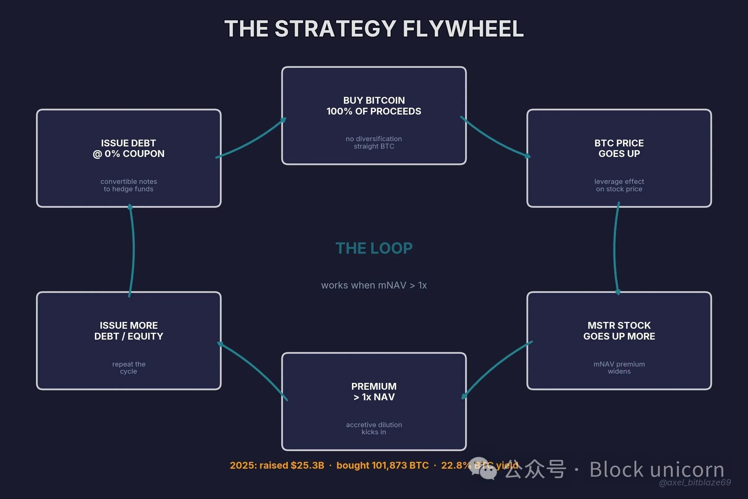 更多比特币 → 比特币价格上涨 → MSTR 股票价格进一步上涨(杠杆效应,债务固定) → 溢价扩大 → 发行更多股票 → 购买更多比特币。