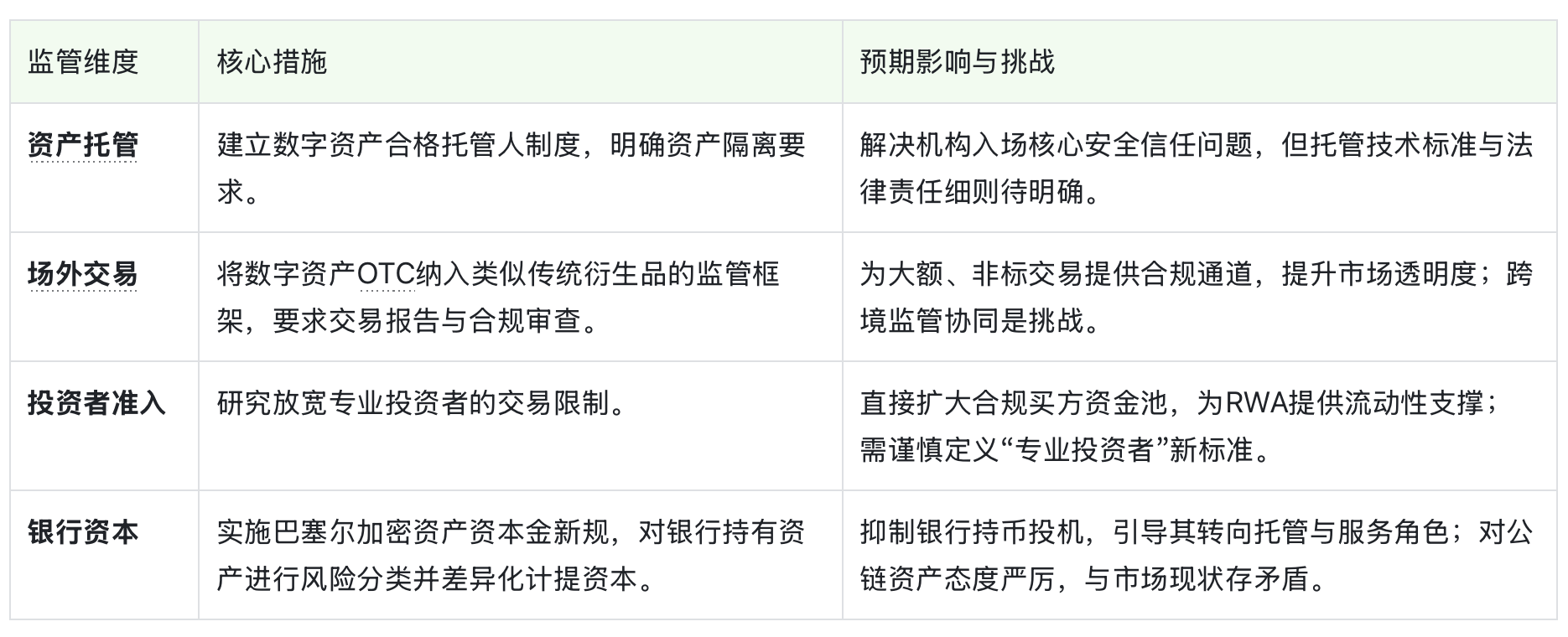 然而,规则也明确了关键豁免:为客户提供托管服务,只要实现资产隔离,通常不会触发额外的资本金要求。这实际上是在强烈引导银行将业务重心从「自营持有」转向「中介服务」。