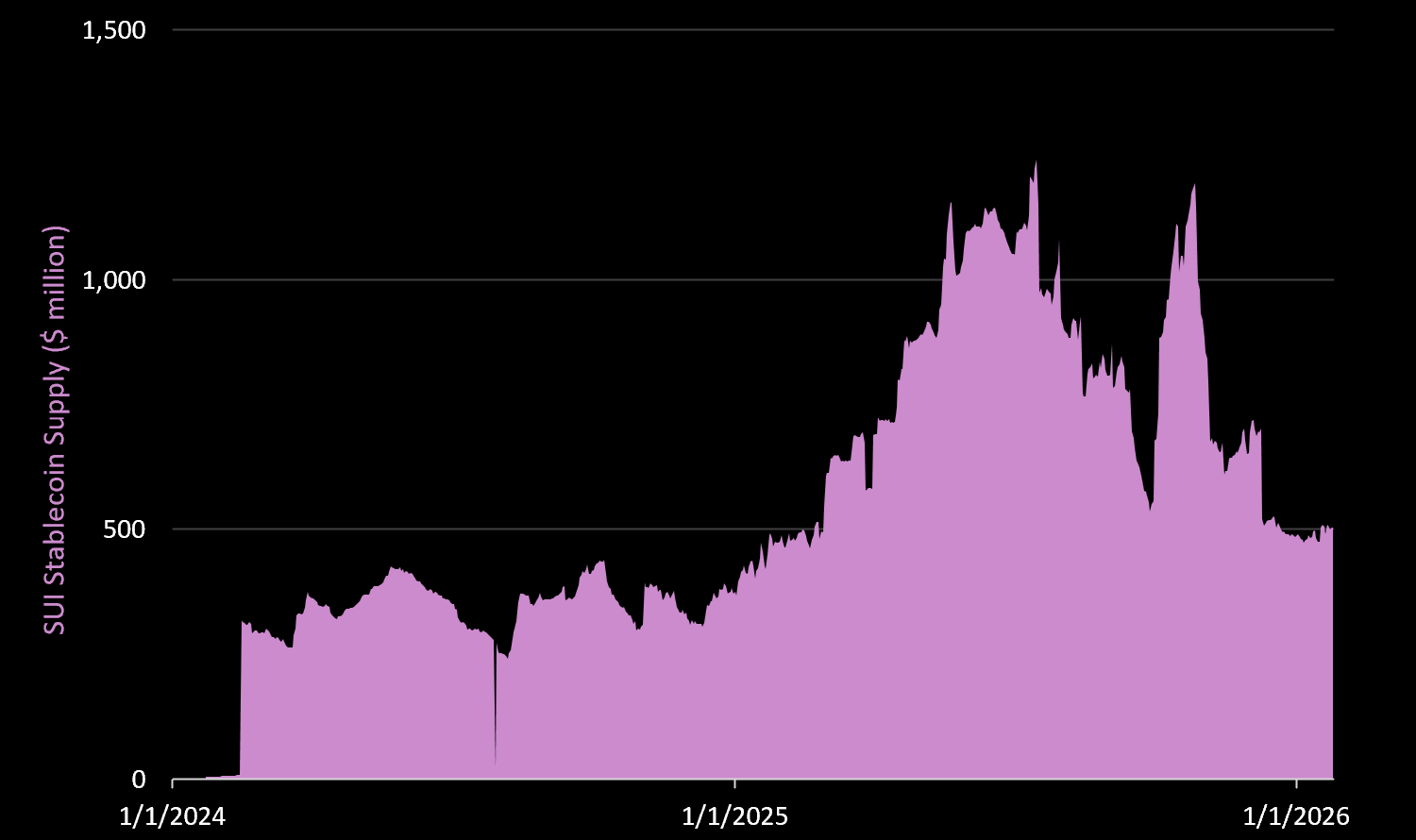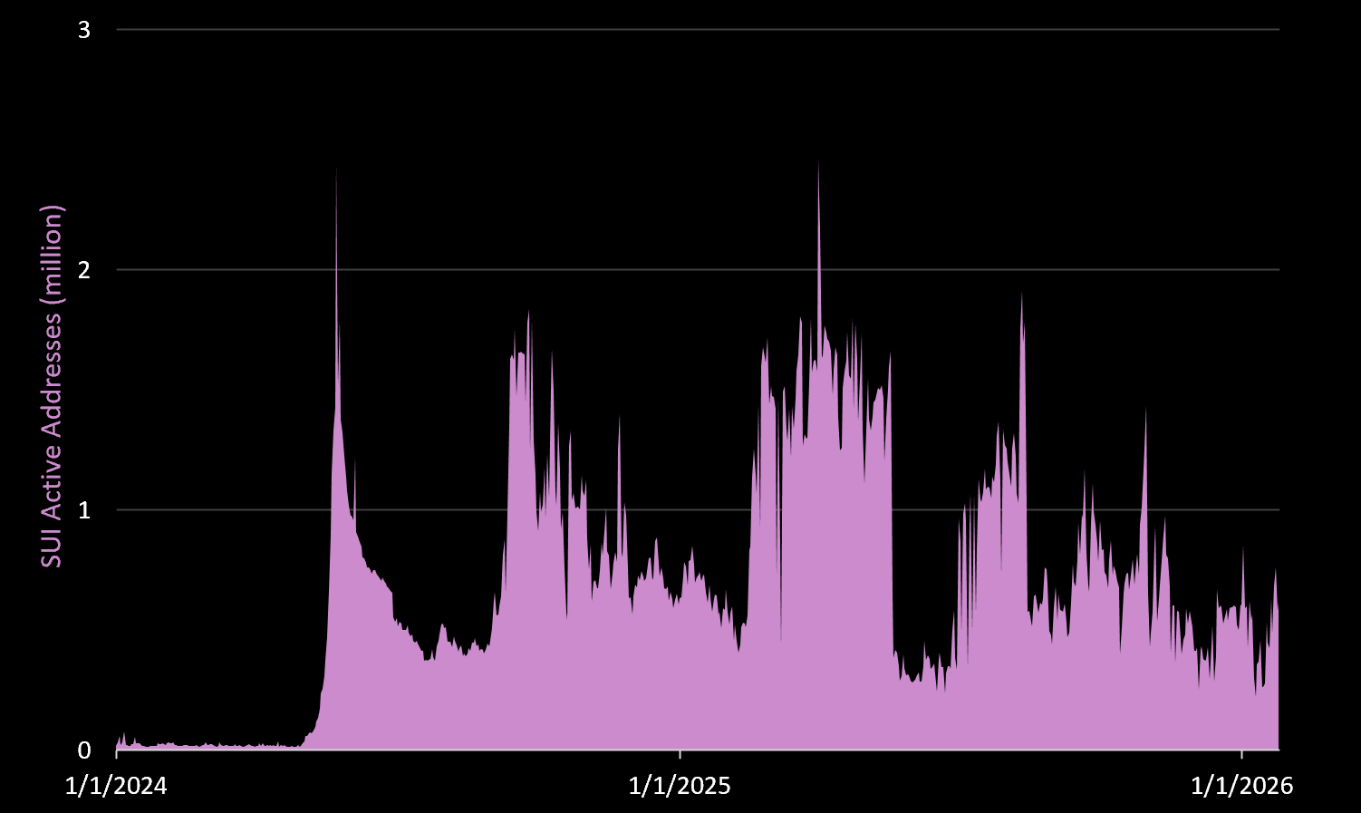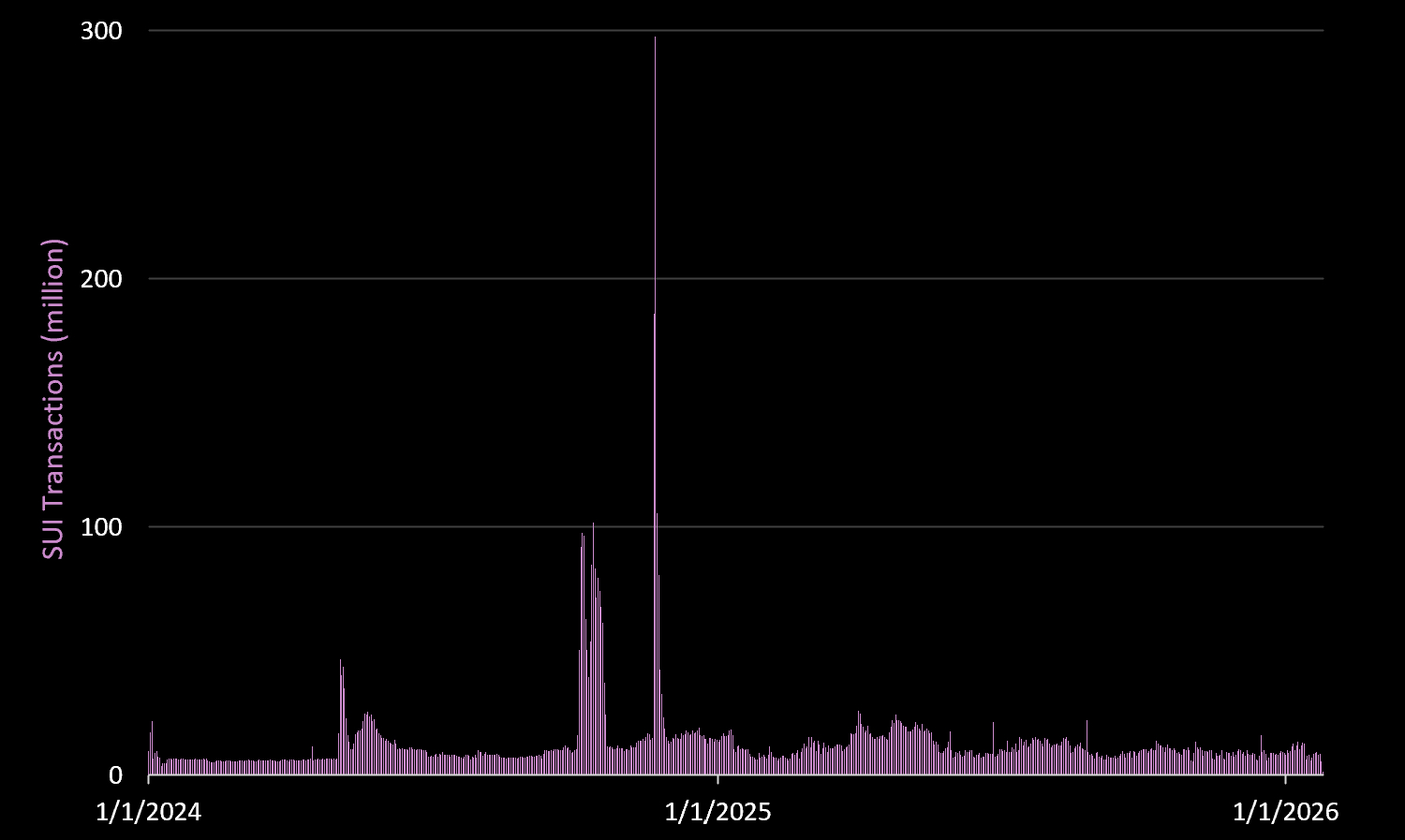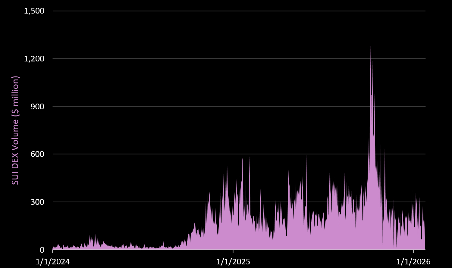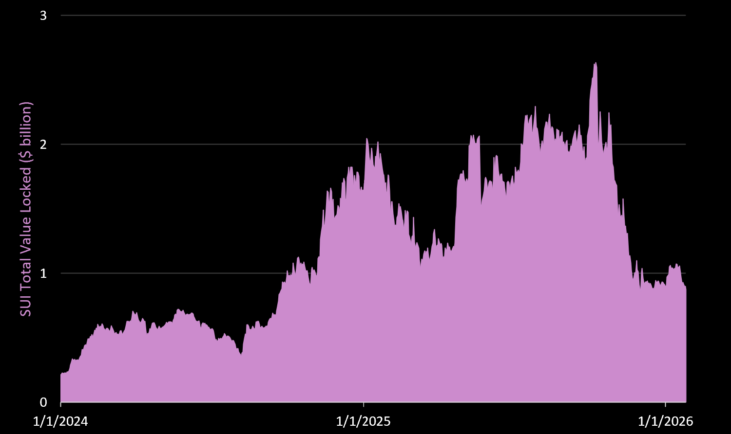 Sui 的总锁仓价值(TVL)目前略低于 10 亿美元,较 2025 年 10 月 9 日峰值的 26 亿美元下降了 61%。我们认为,大部分下降可归因于 SUI 代币价格的下跌,同期该代币价格已下跌 73%。