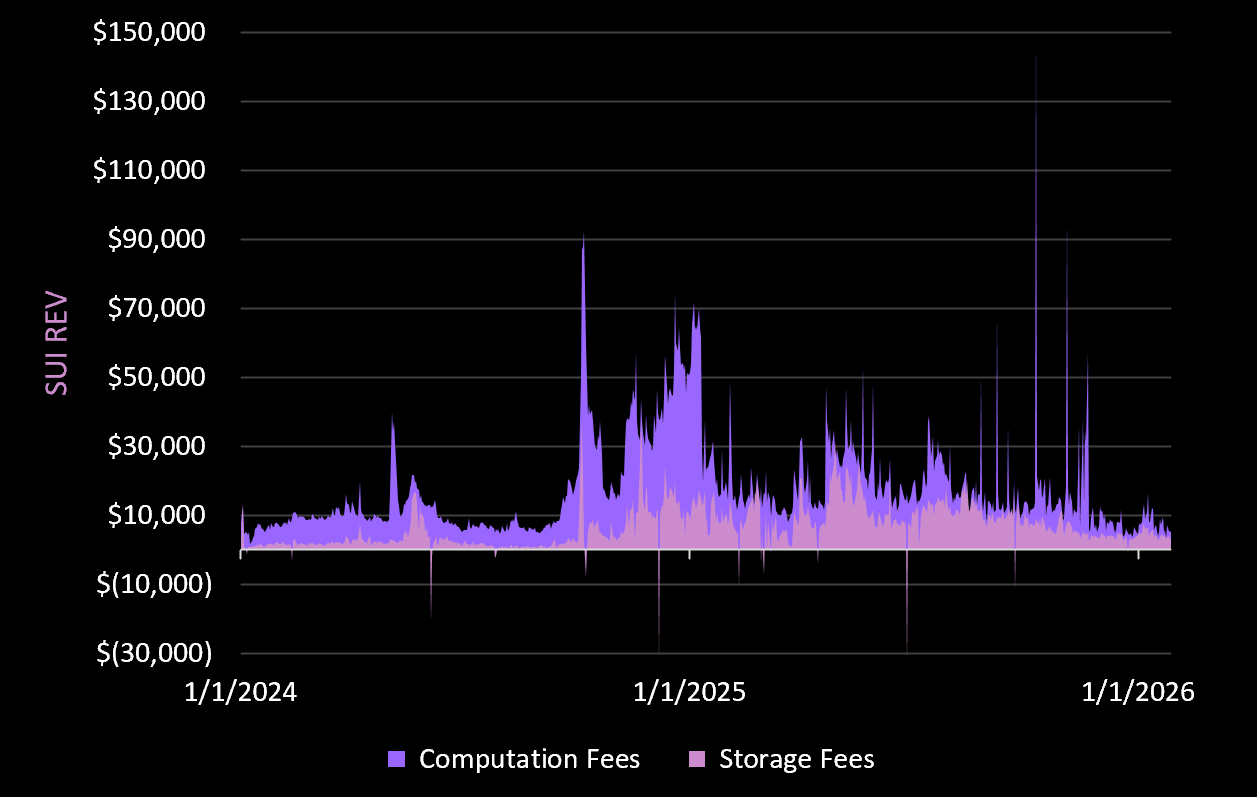 2025 年,Sui 生成的 REV 为 1060 万美元,高于 2024 年的 780 万美元(同比增长 36%)。目前,链上费用较 2024 年末的峰值水平下降了约 83%。