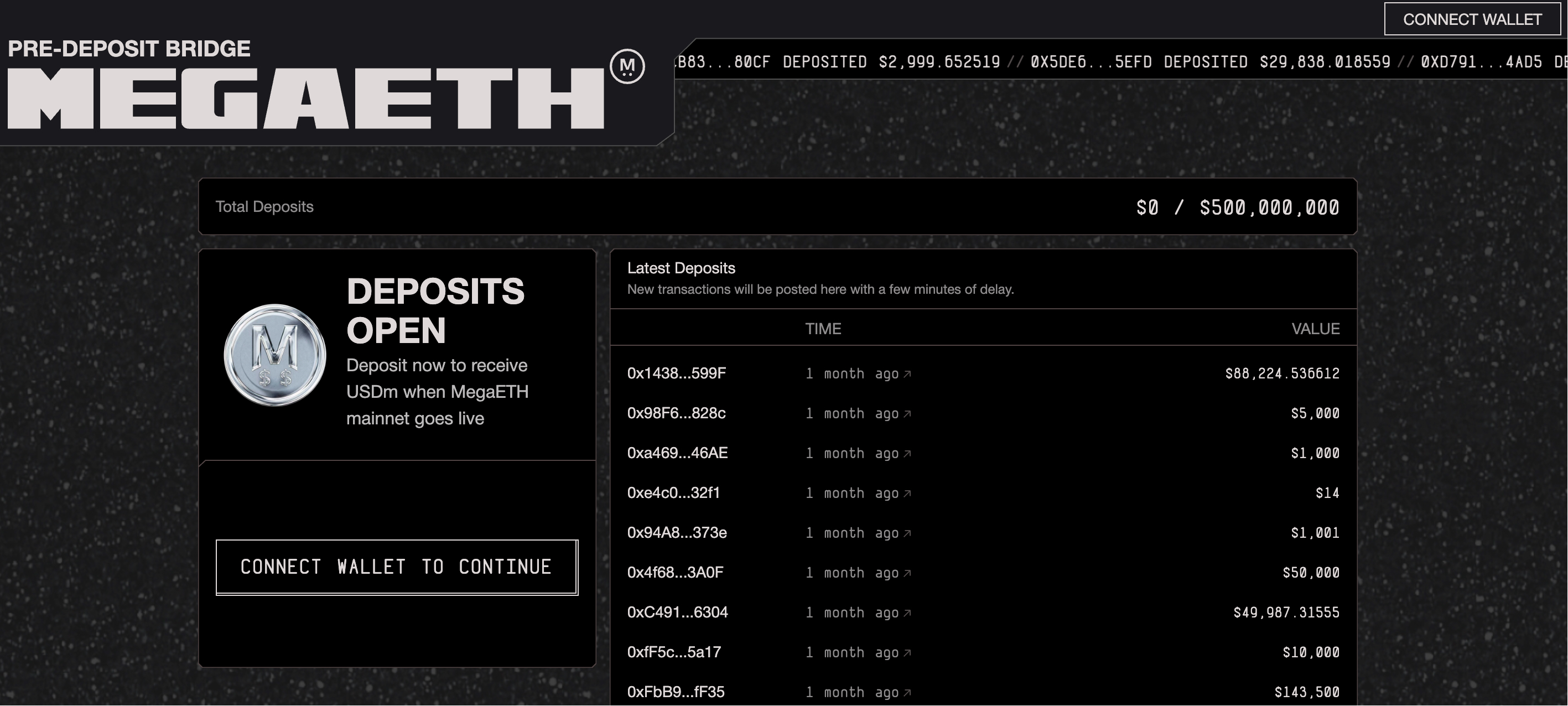 11 月 25 日,MegaETH 推出预存款跨链桥,支持将以太坊 USDC 跨链兑换成 MegaETH 主网 USDm,限额 2.5 亿美元。存款用户将能够在 MegaETH 主网上线时获得 USDm 代币(注,USDm 是 MegaETH 与 DeFi 协议 Ethena Labs 合作推出的原生稳定币,旨在解决当前多个 Layer2 网络通过在排序器费用上加价来获取收入的问题)。