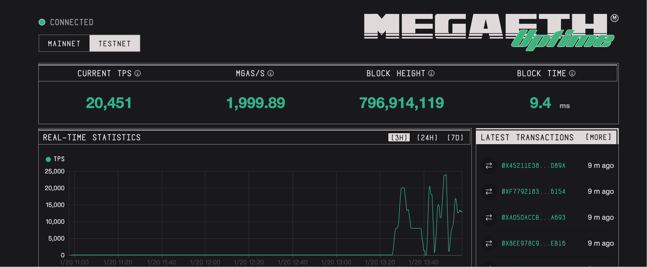 截至撰稿时,MegaETH Uptime 网站数据显示,在过去 3 小时内,MegaETH 测试网 TPS 在 2000-24000 之间上下波动,区块生成时间则处于 9-11 ms 区间内。尽管测试网的 TPS 和出块速度尚未完全达成其设定的目标愿景,但与以太坊现有的主流 L2 解决方案相比,已远远超出。