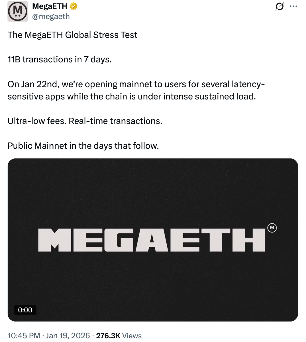 1 月 22 日,以太坊生态明星项目 MegaETH 将上线主网。昨晚,MegaETH 发推表示,主网上线时,将进行为期 7 天的全球压力测试,目标是在测试期间持续、真实地达成每秒 5000 至 35000 笔的交易量(TPS)。测试期间,多个链上互动应用将同步上线,以此检验系统在高负载运行时的稳定性。