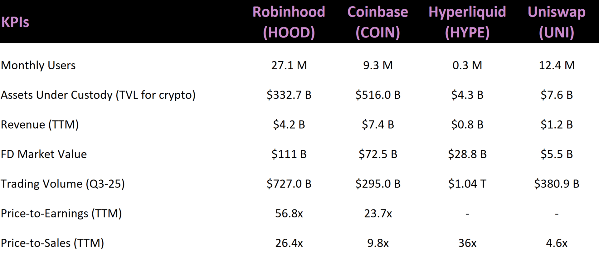 - 市场对 Robinhood 的定位是一家切入消费/零售金融赛道的「超级应用」;而 Coinbase 仍被视为一家「加密货币交易所」(尽管它的业务远不止于此)。