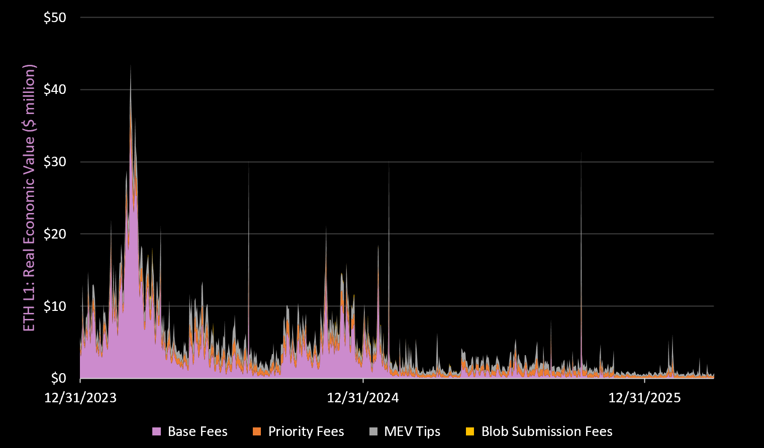 实际经济价值衡量(REV)的是 L1 区块空间的基本费用、优先费用、MEV(最大可提取价值)和 Blob 费用支付情况。基本费用和 Blob 费用会被网络销毁,从而为 ETH 的被动持有者积累价值。优先费用和 MEV 则归验证者和质押者所有。