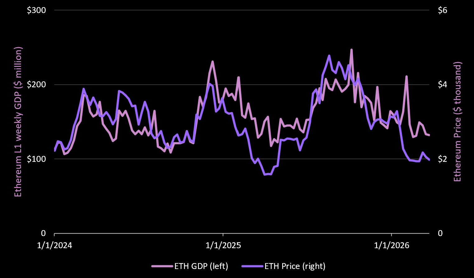 以太坊 L1 GDP 与 ETH 价格存在潜在关联。从某种程度上说,网络 GDP 可为网络估值提供基础依据,因此我们持续密切关注这一指标。
