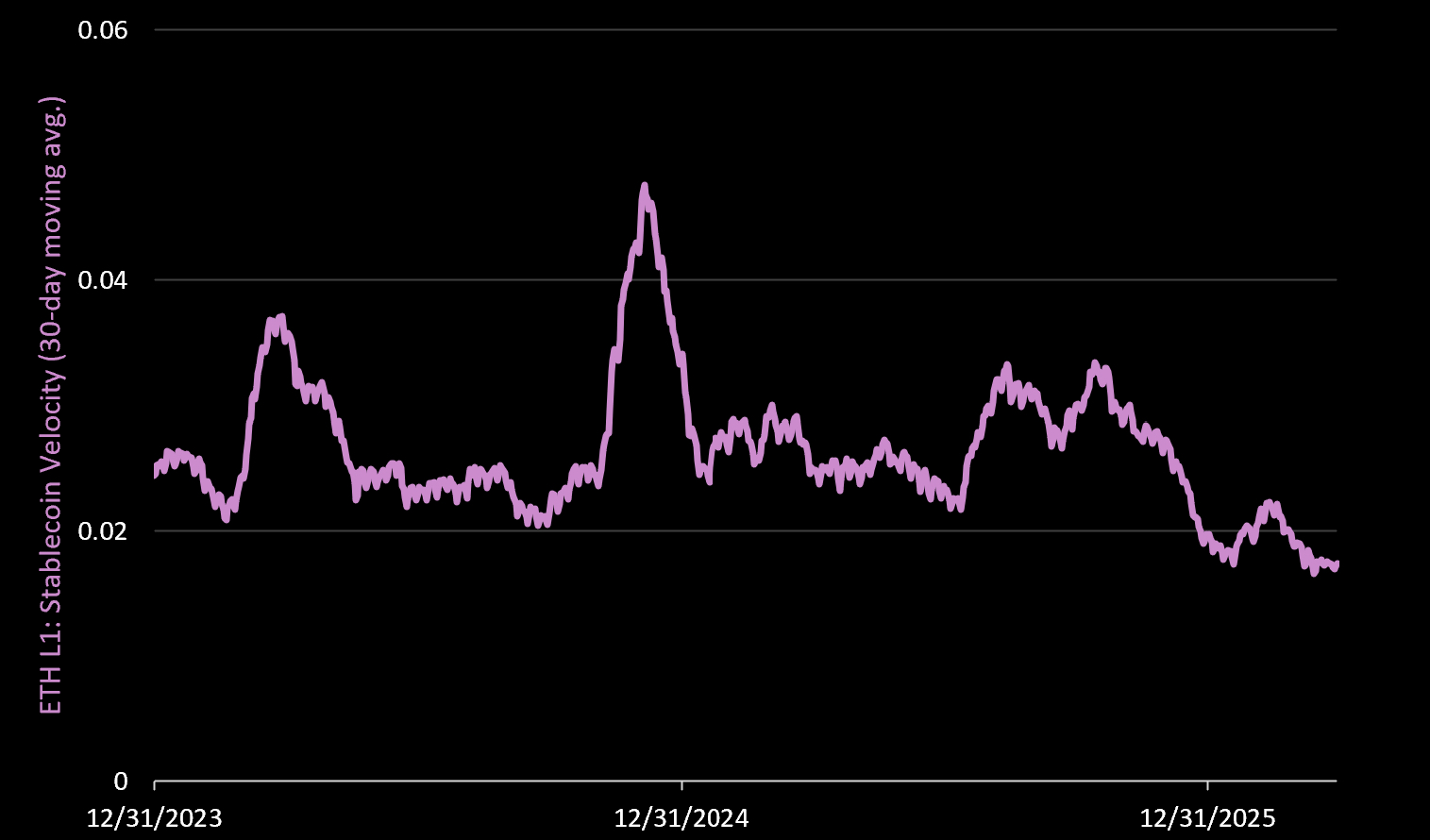 尽管因「避险」情绪导致链上流通速度下降,以太坊仍是链上资产的核心聚集地(TVL 最高的链),而Solana 则已成为高频交易与高速流转的首选网络。稳定币流通速度是追踪这一趋势的关键指标。