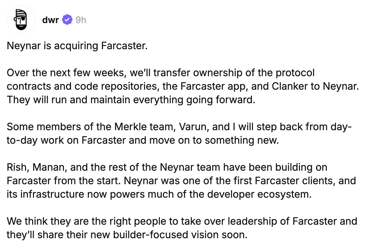 宣布将项目交予生态内的重要基建方 Neynar,理由同样清醒:「经过五年,很明显 Farcaster 需要新的方法和领导力来实现其全部潜力。」