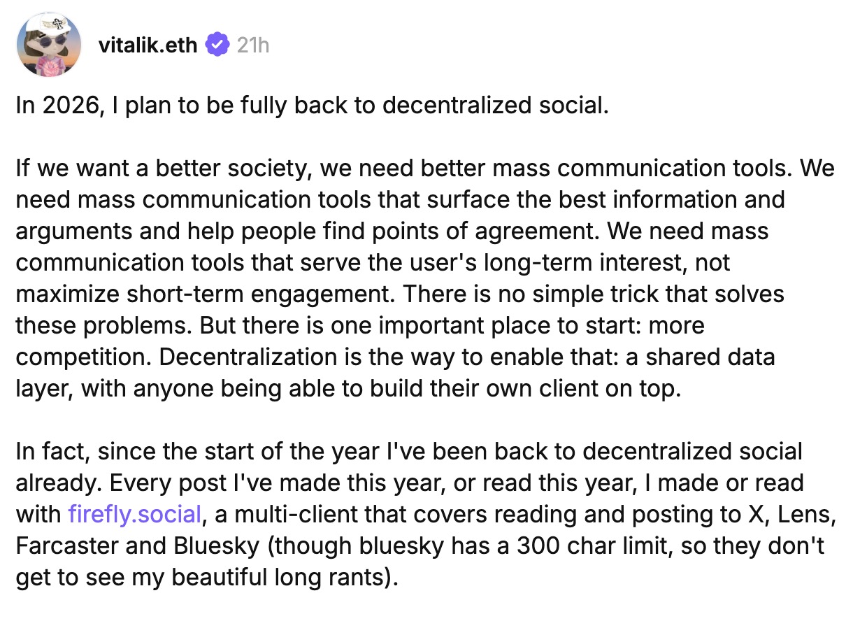 然而,这种基于表面现象的「终结论」,或许恰恰误解了去中心化协议的本质与此次「交棒」的深意。在这一片疑虑声中,以太坊联合创始人 Vitalik Buterin 宣布:「2026 年计划全面回归去中心化社交」。与此同时,资深投资人、Union Square Ventures 联合创始人 Fred Wilson 明确
