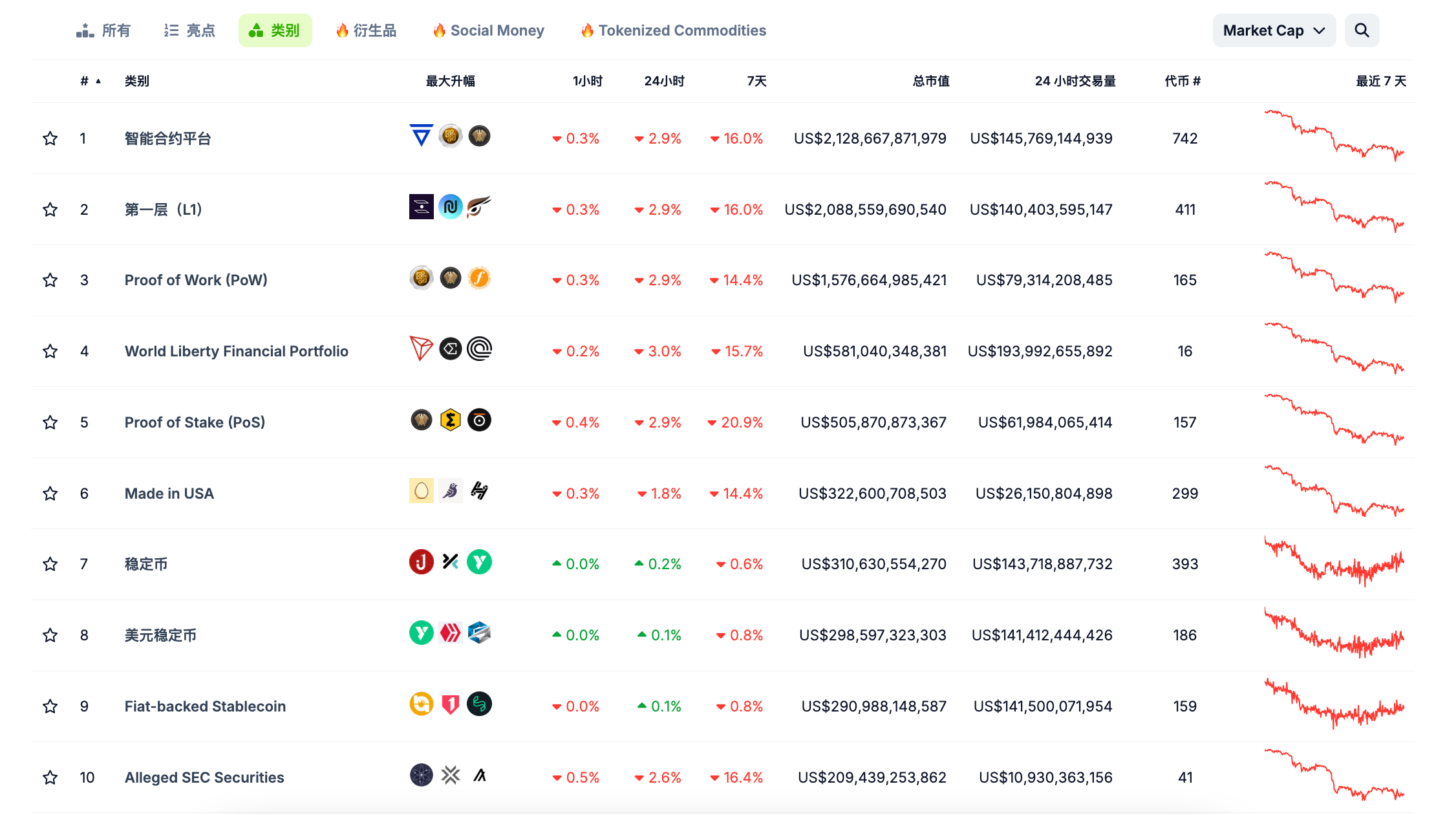但是即便如此,加密市场陷入「全面熊市」阶段已无法避免。Coingecko 数据显示,过去 7 日内,在加密行业排名前十的资产类别中,除稳定币资产外,其余跌幅几乎都超过了 15%,其中 DeFi 资产类别的跌幅更是接近 50%。全球加密货币总市值也降至 2.66 万亿美元,接近 2025 年 4 月的市值水平。