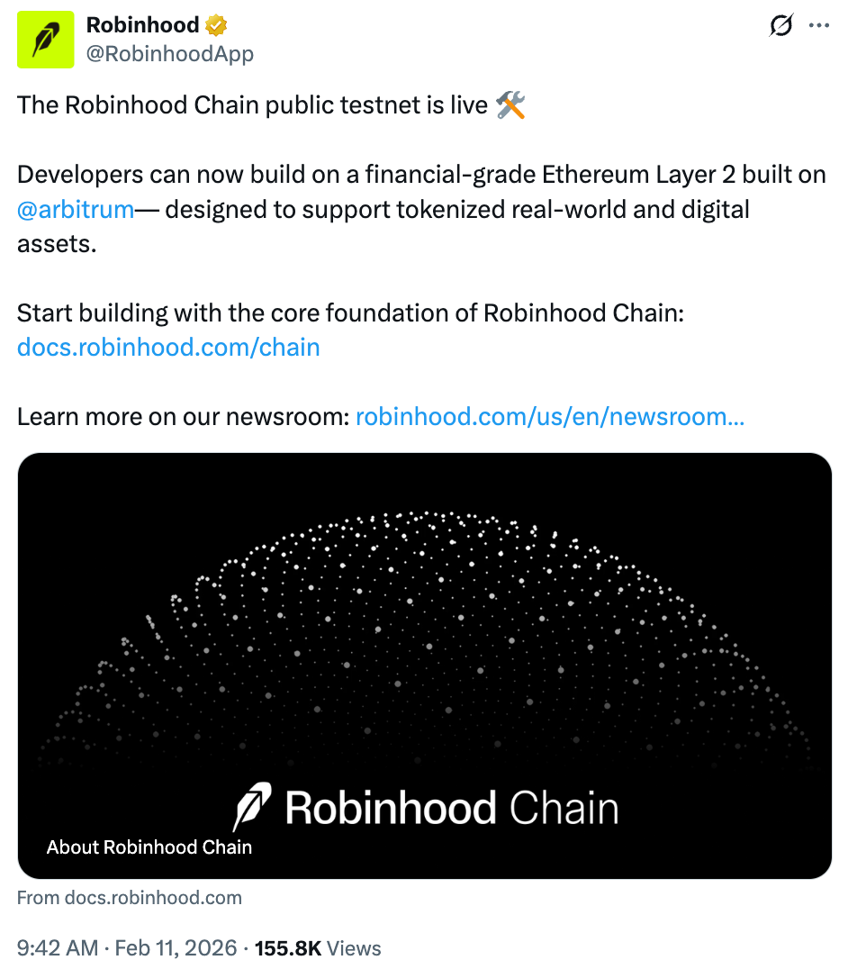 今日,Robinhood 正式对外宣布上线基于 Arbitrum 构建的金融级以太坊 Layer 2「Robinhood Chain」公共测试网。