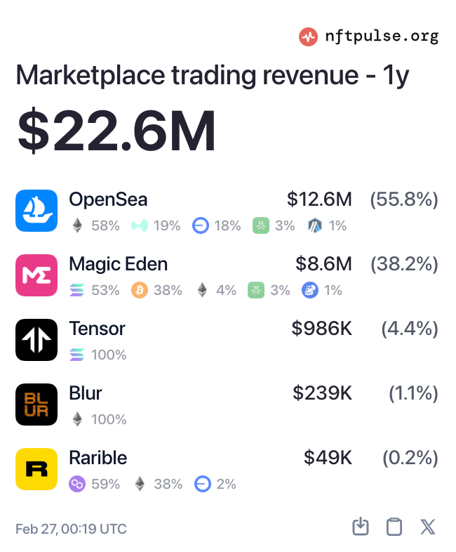 更深层的问题在于,Magic Eden 原有的商业模式缺乏可持续性。Magic Eden 曾依赖交易费抽成,但随着 NFT 交易量暴跌,这一收入来源严重缩水。据 nftpulse 数据,截至撰稿时,过去一年,Magic Eden 的年交易量约为 5.03 亿美元,而市场年交易收入仅为 860 万美元。尽管该公司试图通过 ME 代币的质押奖励(如 USDC 稳定币分红)吸引投资者,但在熊市的寒冬中,代币经济体系难以维系。
