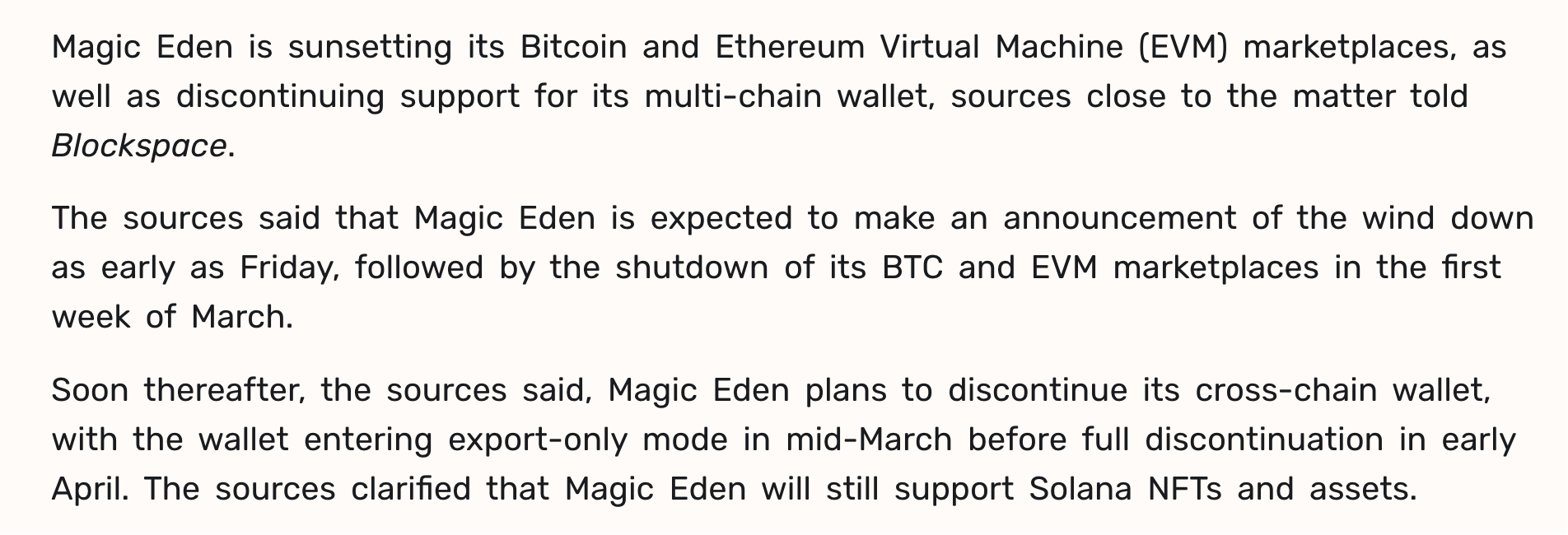 昨日,据 Blockspace 援引知情人士报道,Magic Eden 预计于 3 月第一周关闭其比特币与以太坊 EVM 交易平台,随后多链钱包将于 3 月中旬进入仅导出模式(仅允许用户提取资产),并于 4 月初完全停止服务。相关官方公告或最早于本周五公布。不过,值得注意的是,该平台仍将支持 Solana NFT 与资产。