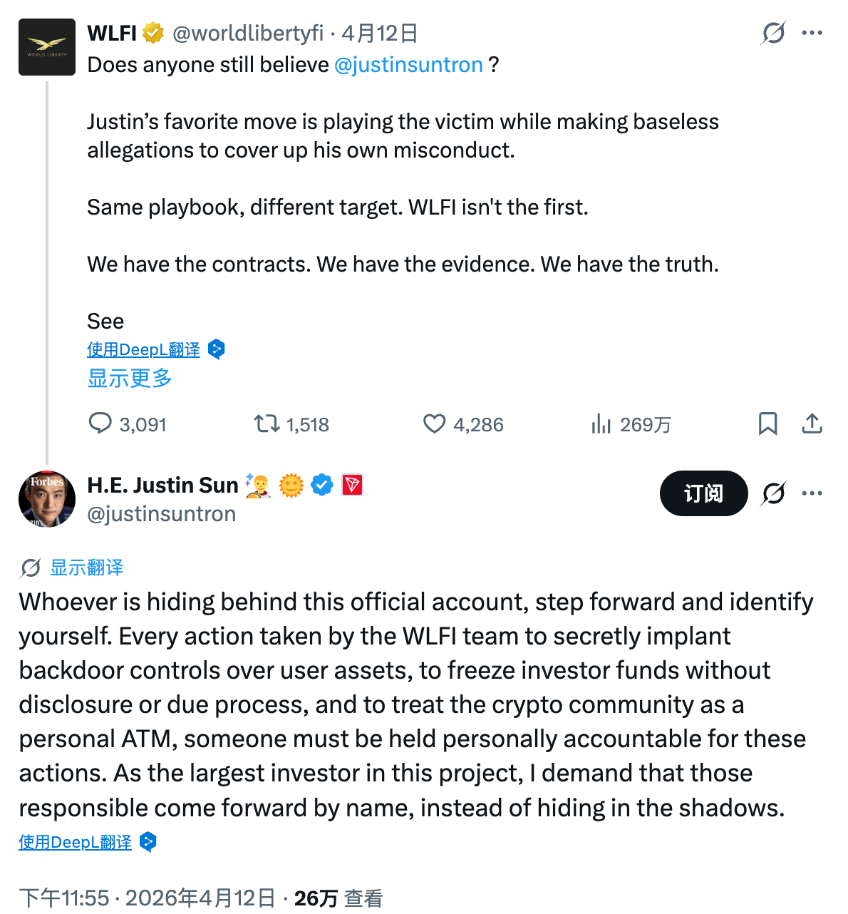 4 月 12 日下午,孙宇晨突然发文炮轰由特朗普家族支持的 DeFi 项目 World Liberty Financial(WLFI)。他抛出了一连串指控,称 WLFI 团队从未获得社区治理授权,却私自向用户榨取费用、秘密植入后门来控制资产、在未经披露和正当程序的情况下冻结投资者资金,甚至把整个加密社区当成了「提款机」。
