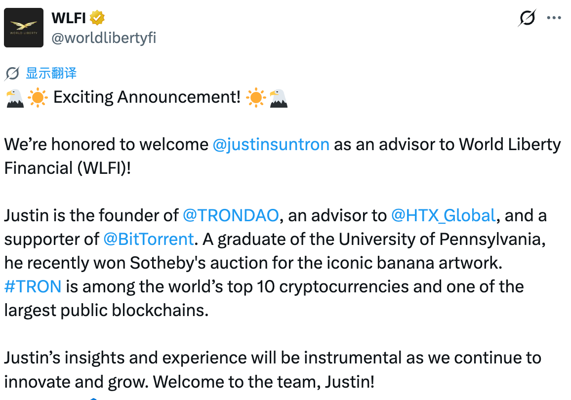时间倒回到 2024 年末。那时候 WLFI 的代币卖得不是很好,几乎没人买单。而就在项目方焦头烂额的时候,孙宇晨西装革履地登场了。2024 年 11 月,他通过关联公司砸了 3000 万美元进去,一下子成了 WLFI 彼时最大投资者,占了当时总筹款额的一半还多。WLFI 官方也很给面子,直接聘请他担任项目顾问,夸他「见解与经验至关重要」。