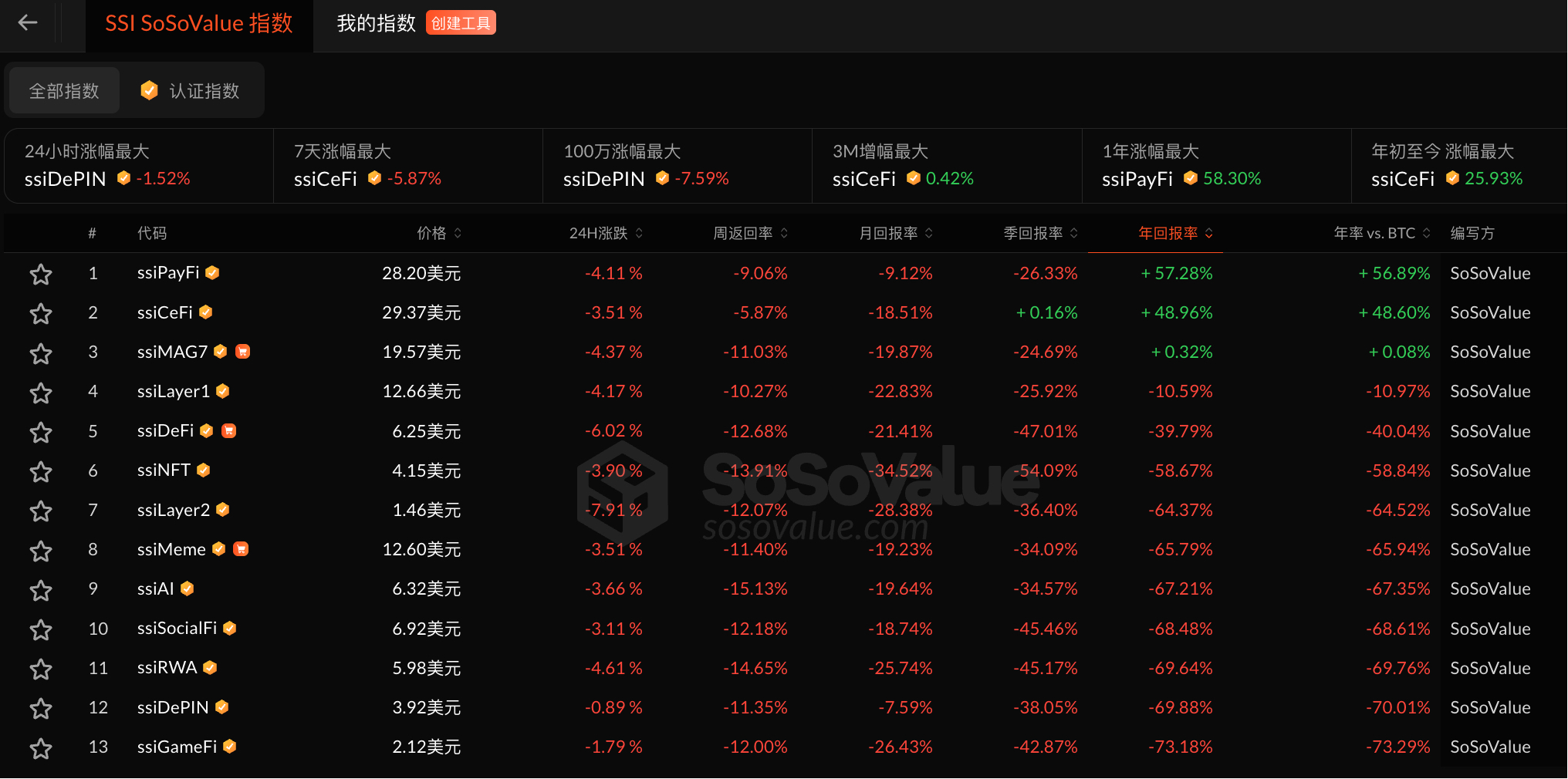 SoSoValue 数据显示,加密市场各大板块无一幸免,集体下跌,24 小时跌幅普遍超过 3%。其中尤以 Layer2、DeFi 板块最为惨烈,跌幅分别达到 7.9% 和 6%。其余板块中 PayFi 板块跌幅达 4.11%、CeFi 板块跌幅达 3.51%、Layer1 板块跌幅达 4.17%、NFT 板块跌幅达 3.90%、Meme 板块跌幅达 3.51% 和 AI 跌幅达 3.66% 等。由此可见,加密市场的下跌之势远比预期来得更加迅速和猛烈。