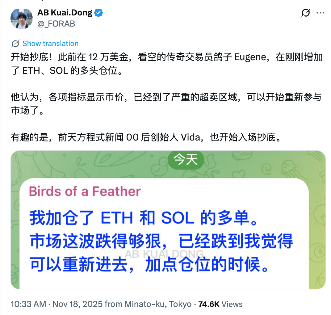 交易员 Eugene Ng Ah Sio 今日在个人频道发文称,「已增持以太坊和 SOL 的多头仓位。摆动指标已经明显回到超卖区间,我认为可以开始重新增加这个市场的风险敞口。」