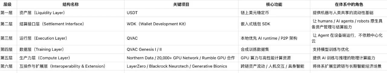 这六层结构形成的是一个自下而上的搭建过程:USDT 提供资产基础→ WDK 让资产嵌入应用与 Agent→ QVAC 让 Agent 在本地运行→ Genesis 数据支持模型训练→ GPU 网络提供算力支撑→ 跨链与具身智能扩展体系边界,这是一种分层式实验,而不是单点产品创新。