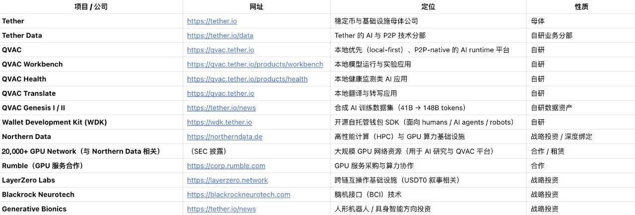 如果只把 Tether 理解为一家稳定币公司,这个页面会显得有些 「跨界」。于是我顺着 WDK 往下查,又找到了 QVAC(本地 AI runtime)和他们发布的训练数据集。再往外扩,我发现他们还通过 Northern Data/Rumble 绑定了一条算力链路,并在跨链互操作与具身智能方向做了投资。信息散落在不同网站、新闻稿和公告里,所以我先把它们整理成一张全景图,接下来再逐层拆解它背后的结构。