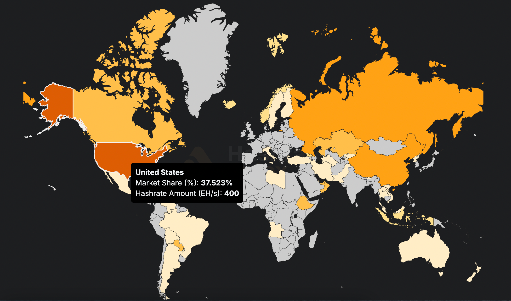 以比特币为例,Hashrate Index 数据显示,美国当前控制着约 37.52% 的比特币算力,位居全球第一;俄罗斯和中国分别以 16.42% 和 11.73% 的比特币算力,排名第二、第三。