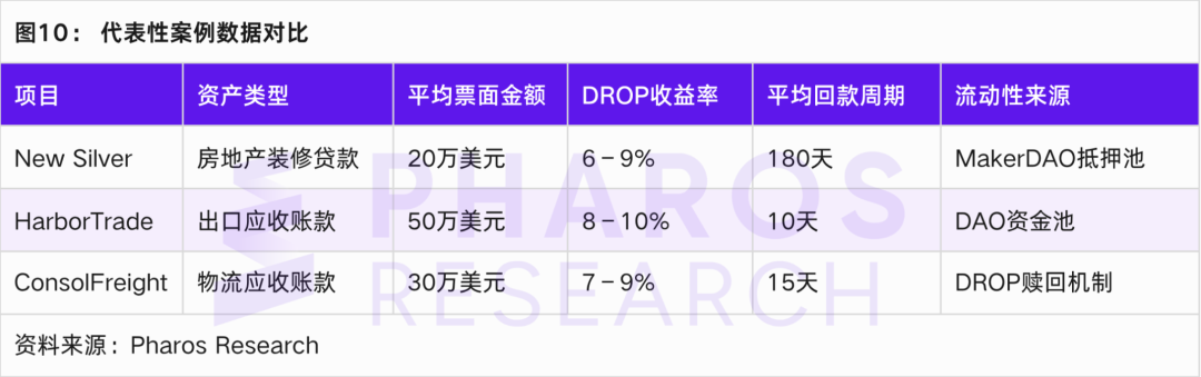 (2)HarborTrade 案例:国际贸易应收账款 RWA 化 HarborTrade 在贸易融资环节引入 RWA 结构,核心资产为出口方应收账款。[12]通过 Centrifuge 系统生成 NFT 凭证后,DROP 投资人资金通过 SPV 直接回流出口企业,融资到账周期由数周级别下降到单周或更短(具体项目可降到 1-2 周,需项目方流水证明)。