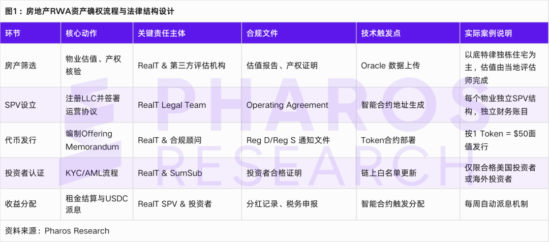 在 RealT 体系中,确权环节是最关键的监管环节。每一处房产在上链前,必须完成产权审查、估值认证及 SPV 登记。该 SPV 通常在美国密歇根或特拉华州设立,以 LLC(有限责任公司)形式存在,RealT 负责物业管理与收益发放。下表展示了 RealT 标准化资产确权流程。