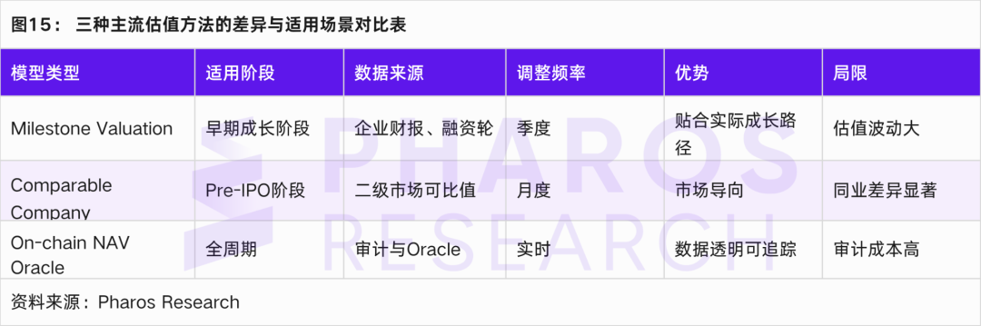 Pre-IPO 股权估值面临的最大挑战,源于其固有的非流动性和信息不对称性问题。为了有效应对这些挑战,RWA 代币化项目通过引入动态净资产值(NAV)模型和可验证报告机制来进行估值和风险缓解。在这一领域,主流平台普遍采用了三种估值路径,以适应不同的市场需求和估值场景。