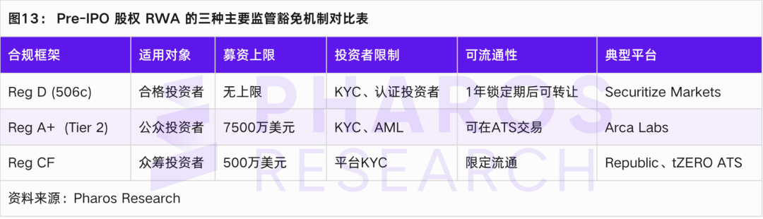 从市场背景来看,随着 Securitize、Arca Labs、Republic 等合规代币化平台的崛起,传统 VC/PE 所持有的非流动性股权资产,开始具备通过区块链进行份额化+证券化的技术路径,其本质类似于将一级市场权益进行结构化拆分,并在受监管环境中引入类二级市场机制;但与 RealT 或 Ondo 等资产不同,Pre-IPO 股权的风险定价、信息披露与转让限制更为严格,因此其制度设计更加依赖美国证券法豁免体系。从具体实现路径看,目前市场已逐步形成以 Reg D、Reg A+ 与 Reg CF 为核心的合规三角:其中 Reg D(Rule 506(c))对应高净值合格投资者,是当前大额融资与机构参与的主通道,其特点是发行效率高但流动性受限(通常需 1 年锁定期);Reg A+(Tier 2)则在一定程度上打开公众投资者参与空间,兼顾融资规模与合规披露要求,使资产具备在 ATS(Alternative Trading System)上的有限流通能力;而 Reg CF 更强调分散化参与+风险控制,其制度设计并非简单降低门槛,而是通过对投资者年度投资额度的动态约束,将其定位为用户参与层或社区权益池,这一点与供应链金融 RWA 中次级资金吸收风险的逻辑存在一定相似性。从案例经验来看,当前主流 Pre-IPO RWA 项目通常采取上层 Reg D/Reg S 募资 + 下层 Reg CF 用户参与的双层结构,以兼顾融资效率与社区扩展,这与前文中提到的结构分层趋势高度一致。因此可以认为,Pre-IPO 股权 RWA 并非简单复制房地产或债券类资产的上链路径,而是在更强监管约束下,对传统私募股权流动性问题的一种制度性修正,其核心价值在于:在不突破证券法底线的前提下,引入链上技术提升资产可达性与流动效率,但其发展边界始终由合规框架所决定。
