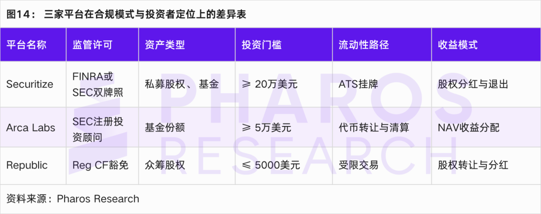 从实践路径来看,以 Securitize、Arca Labs 与 Republic 为代表的三类平台,分别对应了基础设施驱动型、基金结构重构型与众筹普惠型三种典型范式:首先,Securitize 更像是数字证券时代的底层操作系统,其通过打通发行、登记、合规与交易(ATS)的一体化体系,将原本割裂的私募股权流程模块化与链上化,使 Pre-IPO 股权具备可编程流通的可能,其推出的 Pre-IPO Equity Token Program,本质上是帮助企业在 IPO 之前释放部分流动性,同时通过 Reg D 等路径严格限定投资者范围,从而在效率与合规之间取得平衡;其次,Arca Labs 则从资产结构层面进行重构,其将 Pre-IPO 股权纳入基金容器,通过 NAV(净值)机制实现类公募化表达,这种模式的关键不在单一项目流动性,而在组合层面的风险分散与估值平滑,某种程度上更接近传统资管逻辑在链上的映射;最后,Republic 则代表了另一种路径——通过 Reg CF 框架降低参与门槛,将 Pre-IPO 投资从高净值人群向大众投资者延伸,其通过区块链完成股权登记与分红自动化,使小额、多元、分散的投资结构具备可执行性,但与此同时也天然面临更强的流动性限制与信息披露压力。