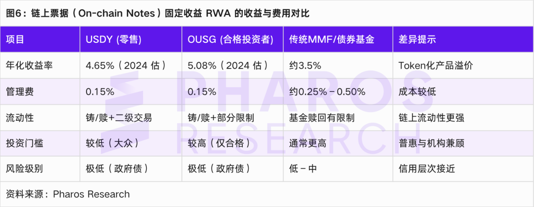 从成本与结构角度看,链上票据(On-chain Notes)相较传统 MMF(货币市场基金)或债券基金,展现出明显的轻量化特征。一方面,管理费显著下降,反映出中介层级的压缩;另一方面,链上铸造—赎回—交易机制,使得资金周转效率显著提升,投资者无需完全依赖基金赎回窗口,而可以通过二级市场实现流动性释放。这种准实时流动性本质上是 DeFi 机制对传统资产的结构性改造,其意义不在于收益率本身的提升,而在于资金使用效率与资产可组合性的提升。换言之,RWA 的竞争力正在从收益更高转向同等风险下效率更优。