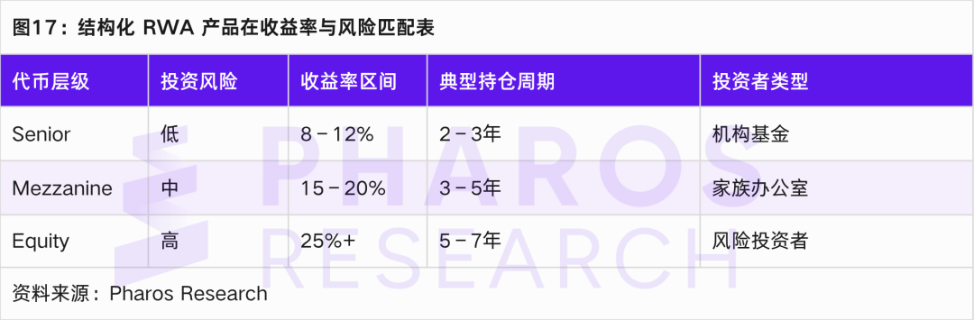 (1)Senior 层(优先级代币):该层代币通常提供稳定的分红,适合低风险偏好的机构投资者,典型的持仓周期为 2 至 3 年[15] ,年化收益率在 8% 至 12% 之间。