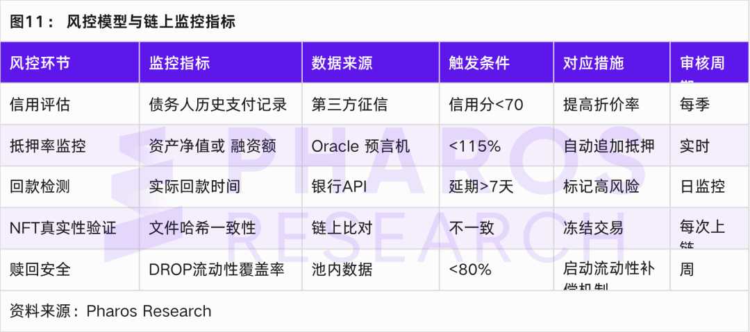当然,这一机制能够成立的前提,在于多重风险缓释手段的共同作用。一方面,Centrifuge 通过分层结构将风险优先分配给 TIN 持有者,从而为 DROP 提供信用缓冲;另一方面,MakerDAO 对 DROP 设置较高的超额抵押率,并配合清算机制控制系统性风险。此外,底层资产仍然依赖 SPV 结构、审计与法律约束来确保真实回款,这意味着链上信用并未脱离现实法律体系,而是形成了一种链上+链下共同约束的混合模式。