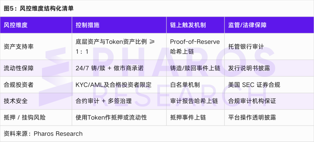 进一步从结构化风控维度来看,其核心并非单一措施,而是链上触发机制 + 传统金融监管的双轨体系。具体而言,在资产支持率方面,通过底层资产与 Token 比例不低于 1:1 的刚性约束,并结合 Proof-of-Reserve 机制实现链上可验证,同时由托管银行提供审计背书;在流动性管理上,依赖 24/7 铸造与赎回机制及做市商承诺,并通过链上事件记录确保全过程可追溯;在投资者适格性控制上,则通过 KYC/AML 与合格投资者制度叠加白名单机制,实现链上权限管理与美国证券监管要求(如 SEC 框架)的衔接;技术层面则依赖智能合约审计、多签治理以及审计报告上链,降低协议层风险;此外,在抵押与流动性使用场景中,所有抵押行为均通过链上记录与平台披露实现透明化,避免隐性杠杆风险累积。