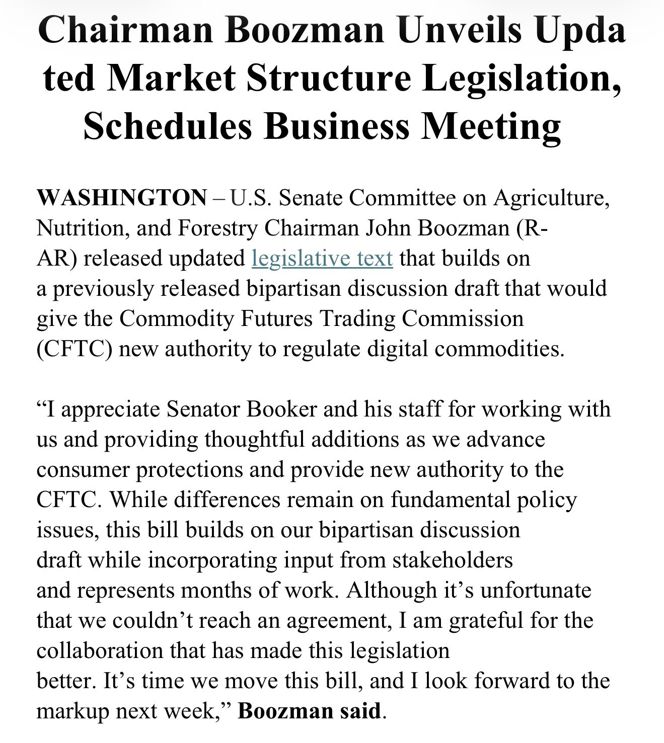 所幸农业委员会的投票会议并未延期,仍按原计划于 1 月 27 日举行。不仅如此,农业委员会今日还发布了最新的加密货币市场结构法案文本《数字商品中介法案》(Digital Commodity Intermediaries Act,DCIA)。