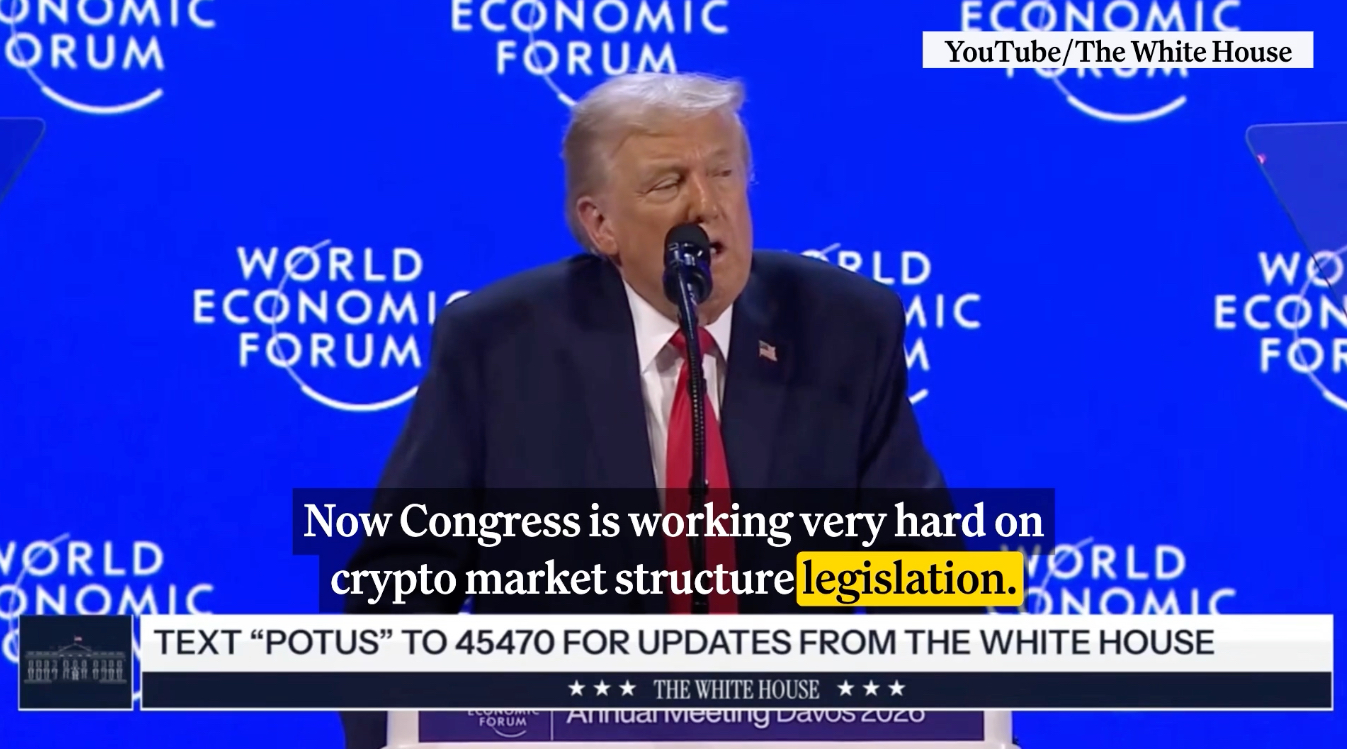 昨日,在瑞士达沃斯世界经济论坛上,美国总统特朗普再度发声,称美国通过支持推动数字资产行业发展的立法,进一步巩固了其作为「世界加密货币之都」的地位。他强调,国会目前正在制定更广泛的加密市场结构法案,希望「很快」就能签署该法案。