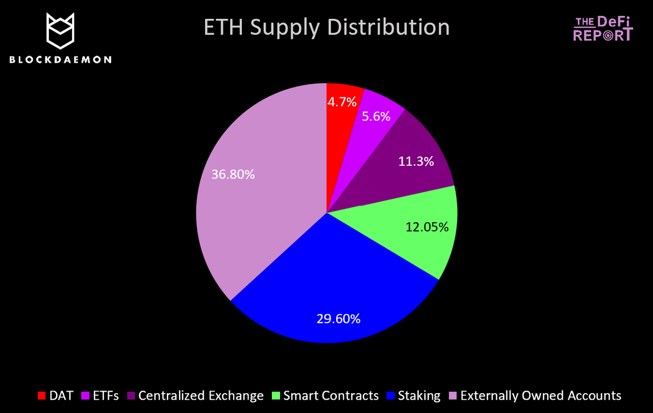 目前约有 670 万枚以太坊(占总供应量的 5.6%)由 ETF 持有,自 7 月 1 日以来这一数字增长了 64%,价值约 260 亿美元。与此同时,另有 560 万枚以太坊(占总供应量的 4.7%)由上市公司持有,这些公司将以太坊作为储备资产。