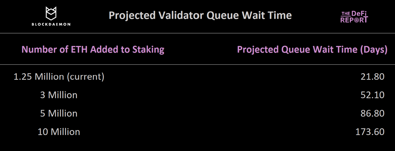 以太坊协议并非设计用于处理可能来自受监管的 ETH 质押产品的需求。下面,我们可以看到各种场景对验证者进入/退出队列等待时间的影响: