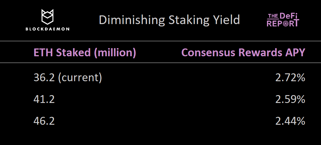 因此,奖励压缩是数学上的确定性。在下图中,可观察到随着质押 ETH 增加(蓝色曲线),共识奖励 APY(粉色曲线)的下降趋势: