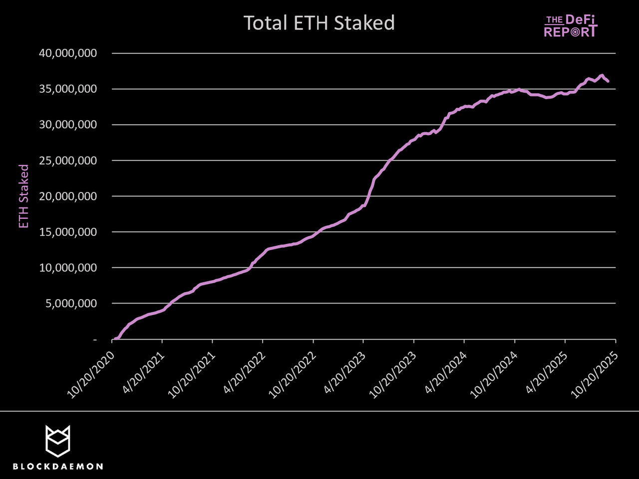目前有超过 3600 万枚 ETH 锁定在质押合约中,占流通供应量的 29.8%。过去一年中,质押 ETH 总量增长了 4%,而过去两年则增长了 33%。