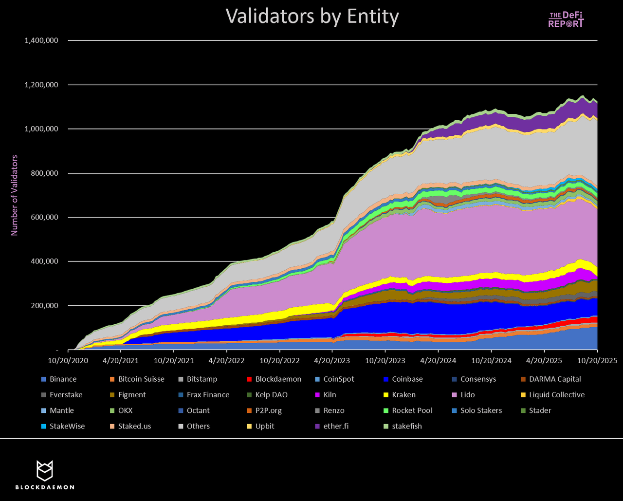 历史上,以太坊上每个验证者的有效余额上限为 32 枚 ETH/验证者。例如,若某实体控制 100 万枚 ETH,则相当于 31250 个验证者。因此,领先的 ETH 质押实体需在以太坊分布式架构中启动并管理数万个验证者。