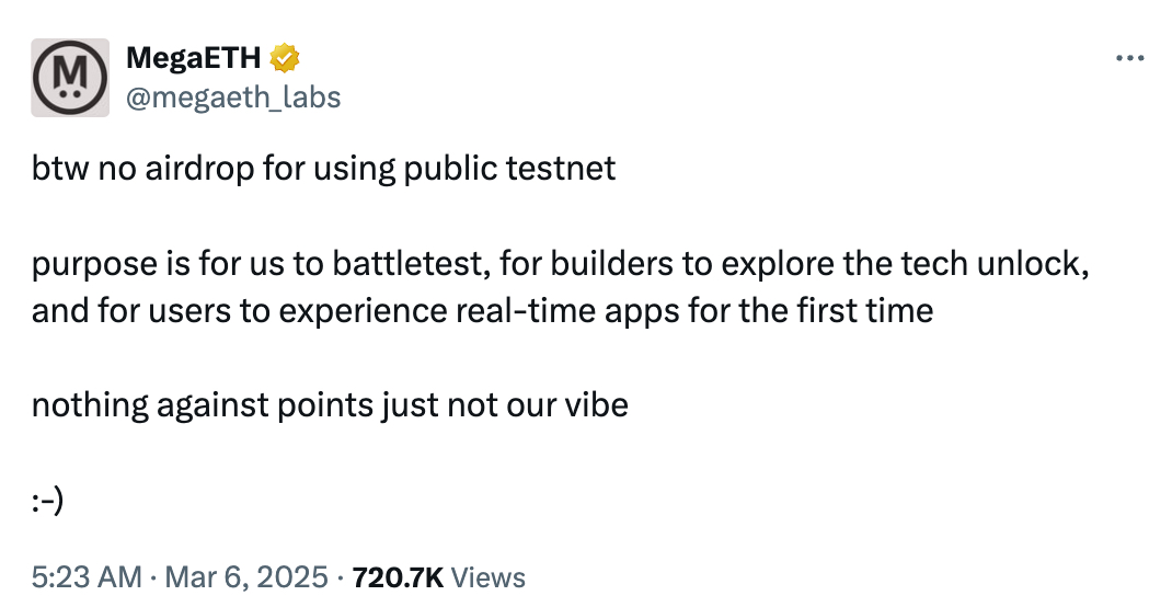 从以上代币经济模型中,我们不难发现,MegaETH 并未明确提及针对早期用户和测试网用户的大规模社区空投计划。实际上,早在 3 月公开测试网之际,MegaETH 就已清晰表态,不会为参与测试网的用户提供空投奖励。其表示,公共测试网的主要使命是进行技术压力测试,让开发者能够深入探索新技术突破,同时让用户首次体验实时应用。尽管他们并不排斥积分激励模式,但这与项目的核心理念并不相符。