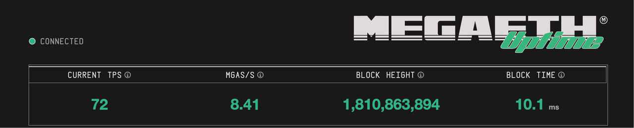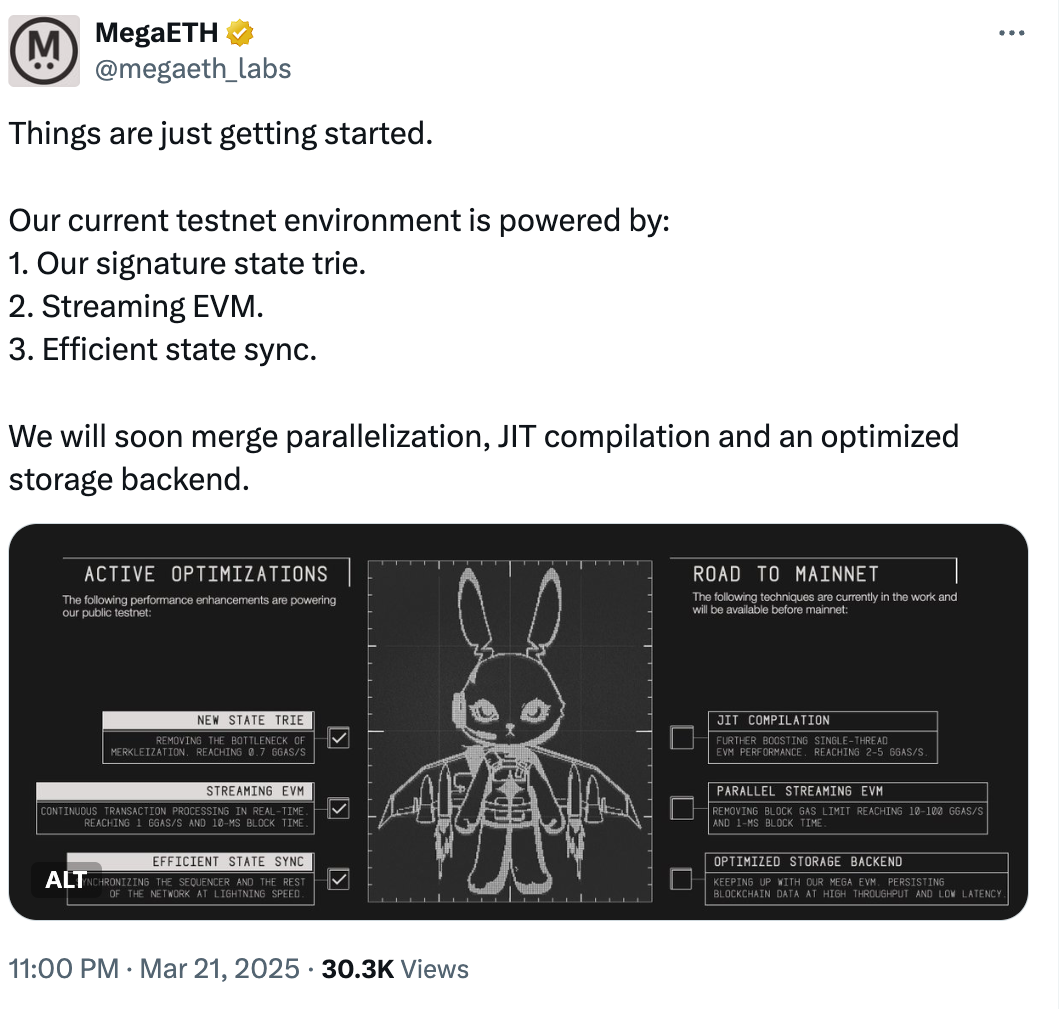时间来到 3 月 21 日,在社区的翘首以盼中,MegaETH 宣布开放公共测试网。该测试网一推出便展现出了强大的性能实力,支持 2 万 TPS、1.7 Gigas/s 计算能力和 10 ms 出块时间,并且仅用 15 秒就向超 19 万个钱包空投了测试网 ETH。尽管该测试网与宣称的 10 万 TPS 存在不小差距,但已远超主流 L2 解决方案,这无疑是令人感到惊喜的。