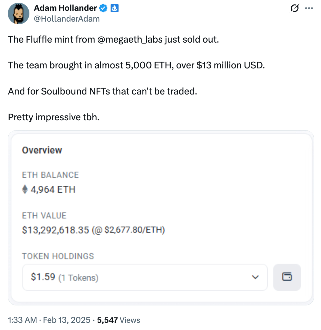 同年 12 月,MegaLabs MegaLabs 再次发力,借助 Echo 平台以「股权加代币认股权证」的方式完成 1000 万美元融资。彼时,场外交易(OTC)市场对 MegaLabs 的估值已经远超 1 亿美元。今年 2 月,MegaETH 又通过 Soulbound NFT 系列 The Fluffle 开展社区融资,筹集了 4964 枚以太坊,当时价值约为 1329 万美元。不得不说,MegaETH 的融资历程算是相当顺利的。