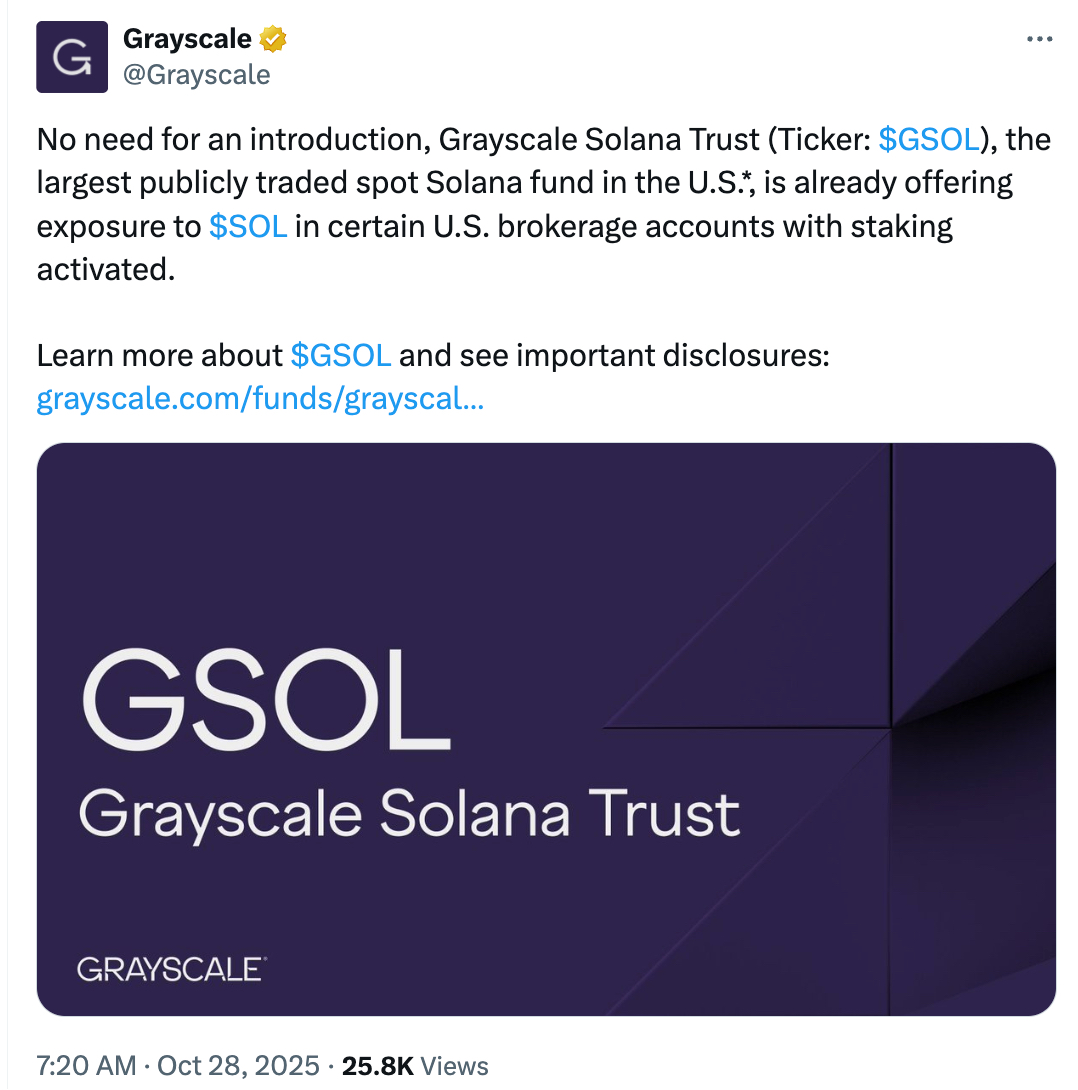 今晨,灰度(Grayscale)在 X 平台上宣布,灰度 Solana 信托(代码:GSOL)作为美国规模最大的公开交易现货 Solana 基金,现已在部分美国经纪账户中提供 SOL 投资敞口,并支持质押功能。不仅如此,据 The Block 援引知情人士消息,灰度 Solana Trust ETF 计划于本周三正式上市。