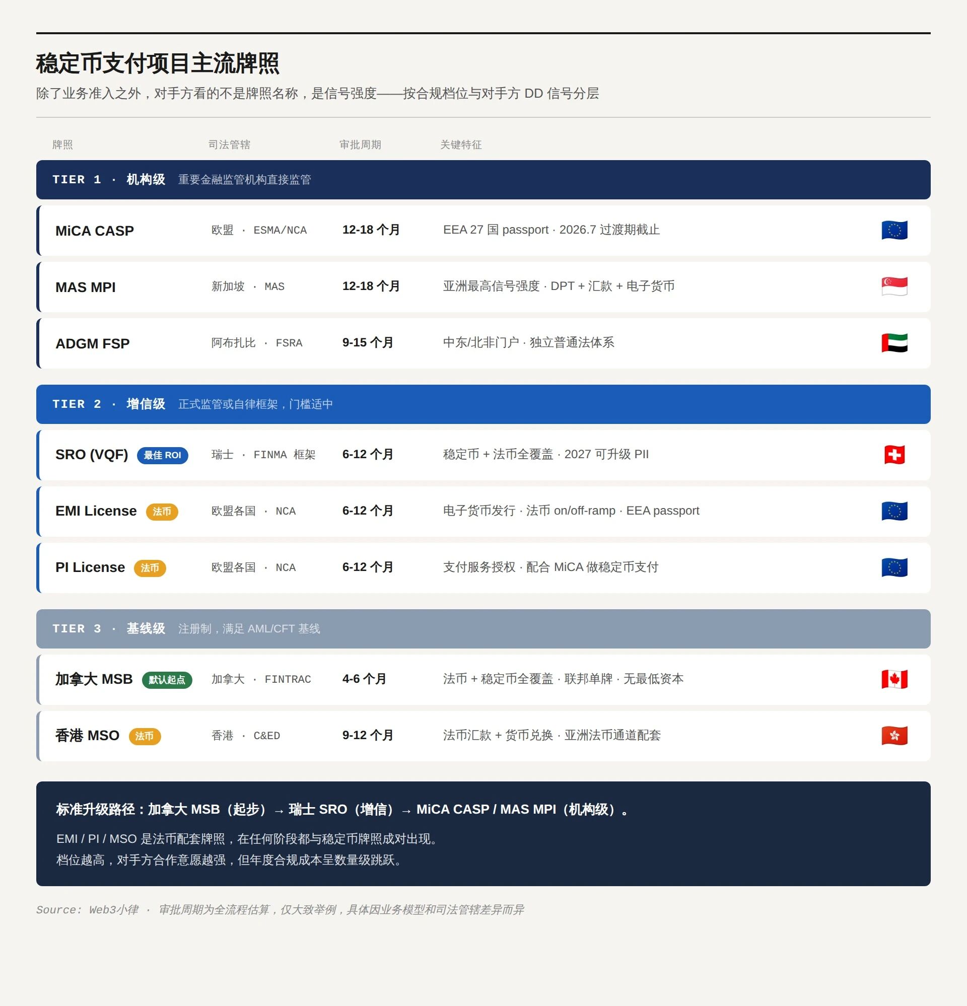稳定币支付项目最常见的牌照,按"合规档位"和"对手方信号强度"排开: